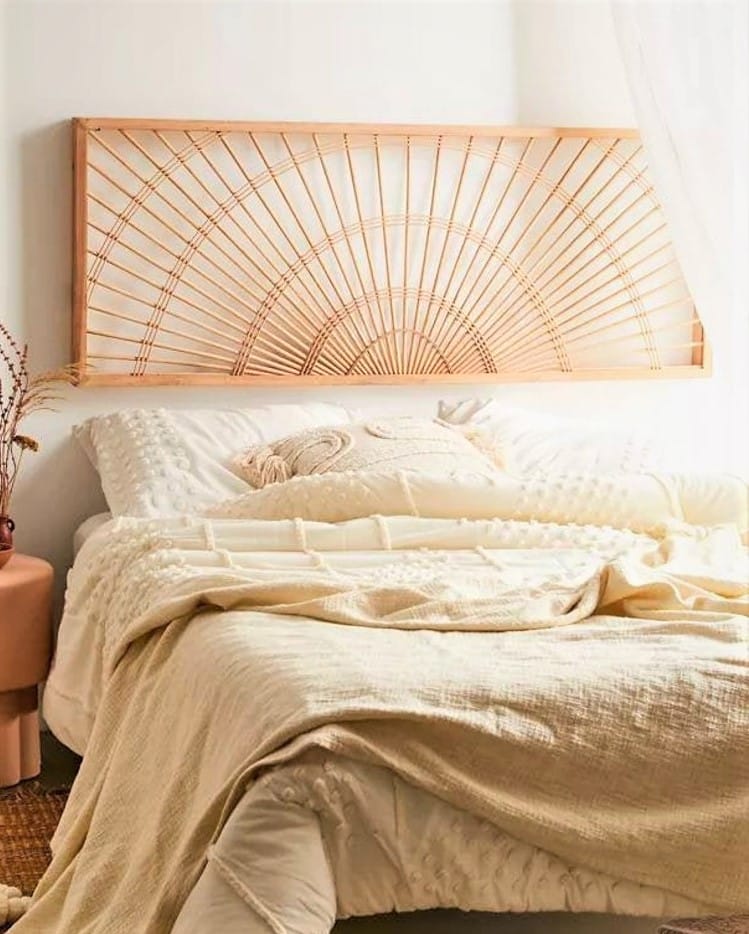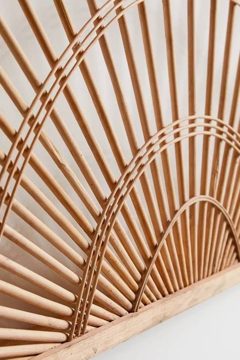 Suspend this refined bohemian headboard above your bed or as a centerpiece above your sofa, lending a beaming look reminiscent of sunshine to your space. Crafted from wood with a rectangular frame and rays of bamboo running across in an arc.