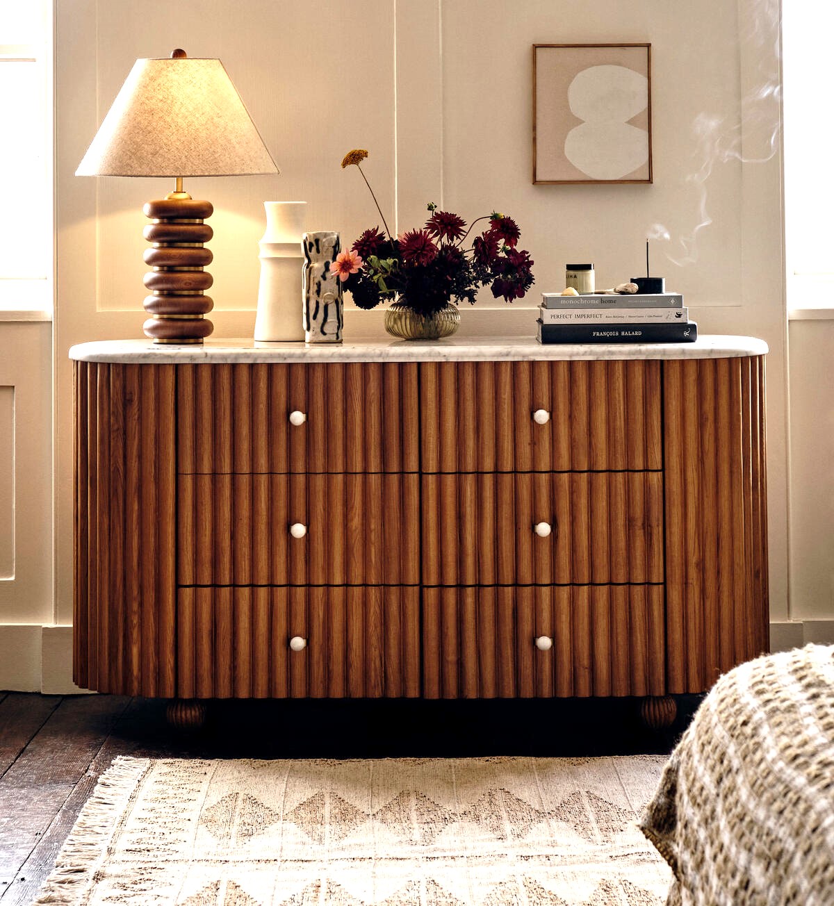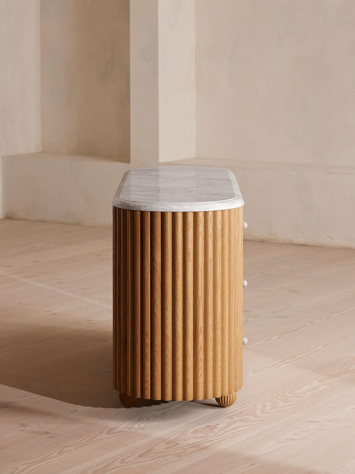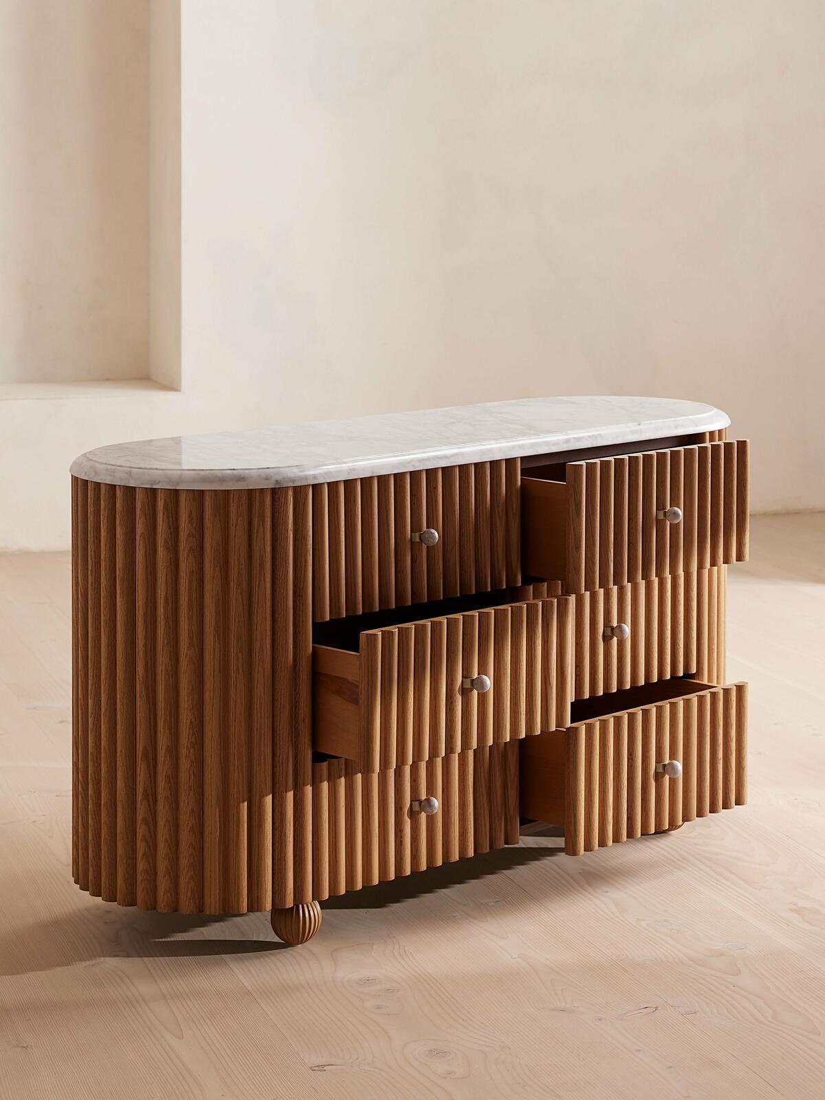 Inspired by the designs at White City House, the Carlisle six drawer dresser in solid oak has been intricately carved with ridged lines to create texture and depth in the bedroom. Italian Carrara marble handles and a matching polished top add a material contrast, with variations in the marble making each piece unique to you. Add a table lamp and your favourite objects on top for a curated display.