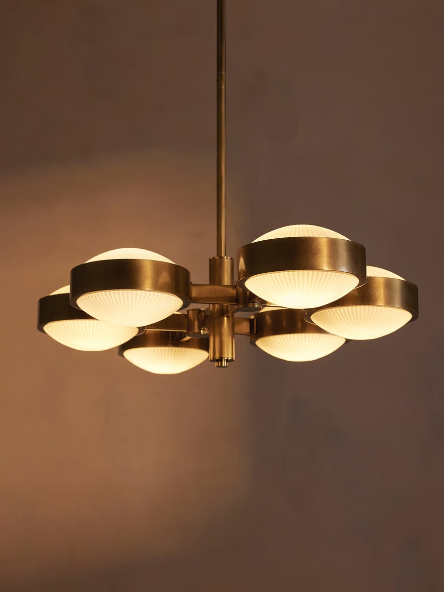 The Edith chandelier is a vintage style that draws inspiration from the 1970s interiors of White City House. Six moulded and ribbed glass shades sit on an antique brass-finish frame, which when lit give off a warm, milky glow. Hang low over a dining table or above a stairway to bring the area into focus.