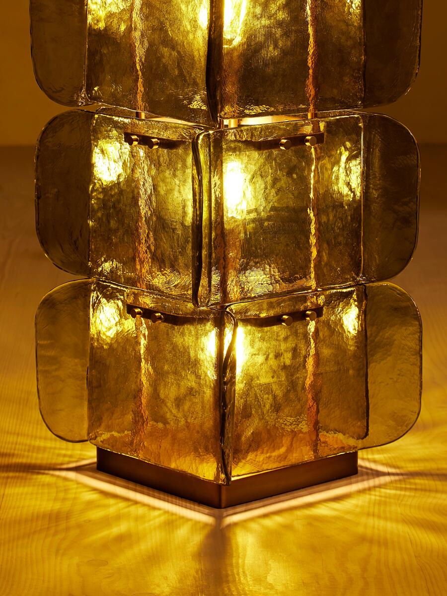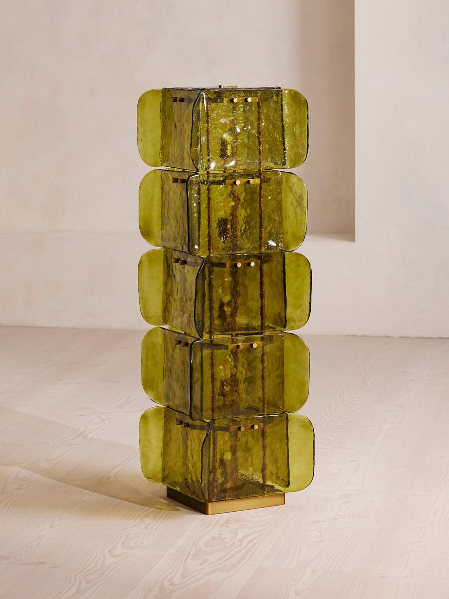 Made using a tessellation of curved, moulded glass, the Elias Floor Lamp has a bulb at every level for an even, warm glow. The Elias floor lamp is made from square blocks of green, moulded glass stacked into a column-style silhouette. At the centre, a brass-plated framework is treated with an antiqued finish.