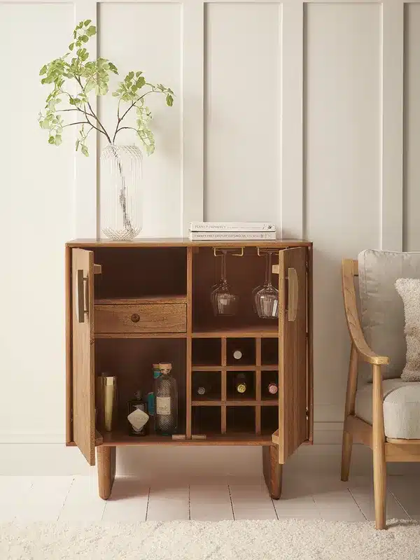 Opening the doors is like lifting the lid on a jewellery box. Here you will find all the makings of a chic drinks cabinet, with a wine rack area, two hanging rails for stemmed glasses, a drawer for the corkscrew and plenty cubby hole space for any extras.