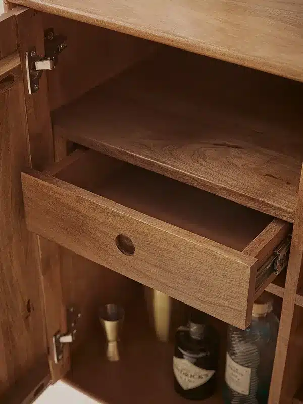 Display cabinet made of mango wood with travertine and gold trimmed door handles.
