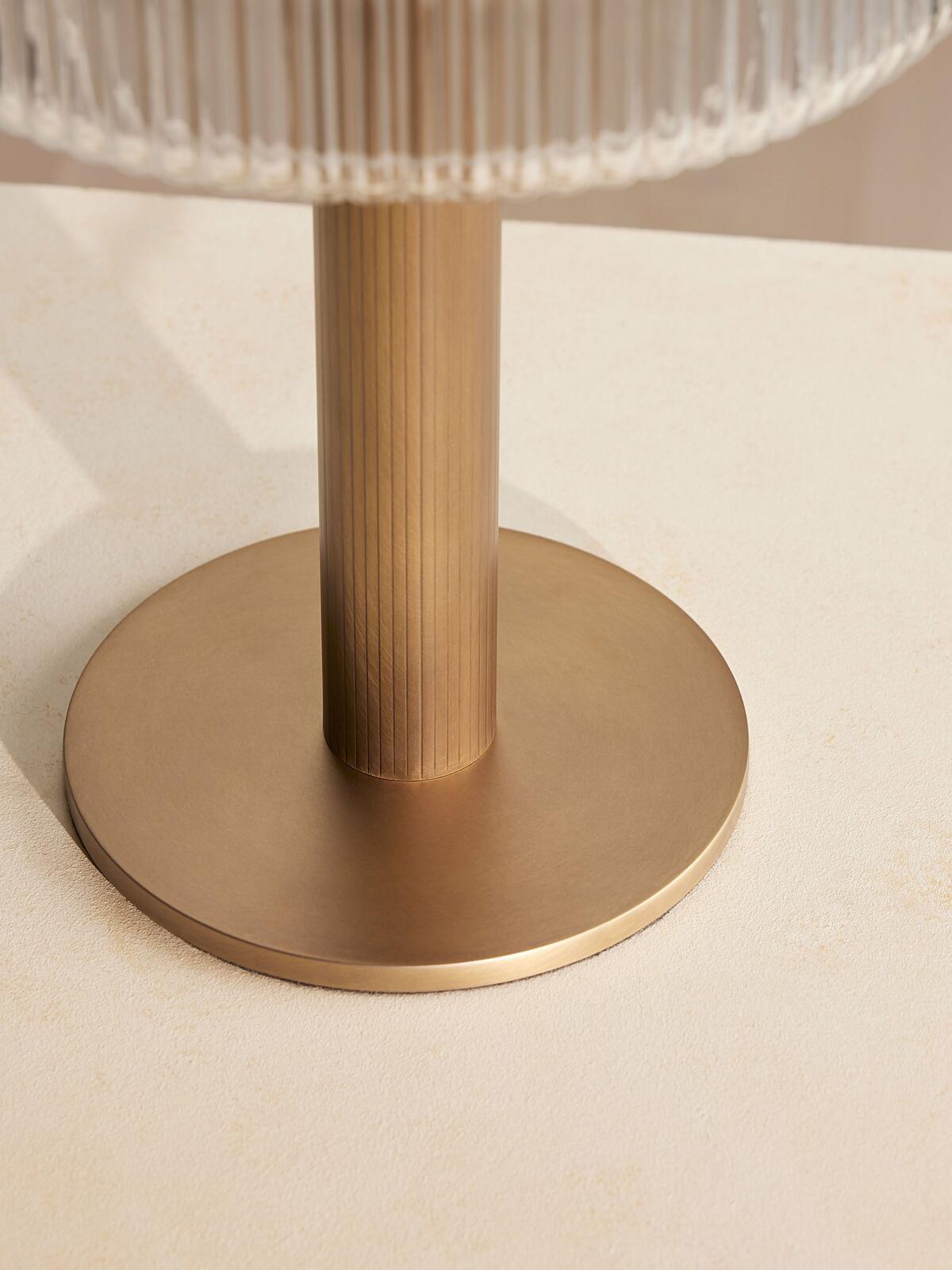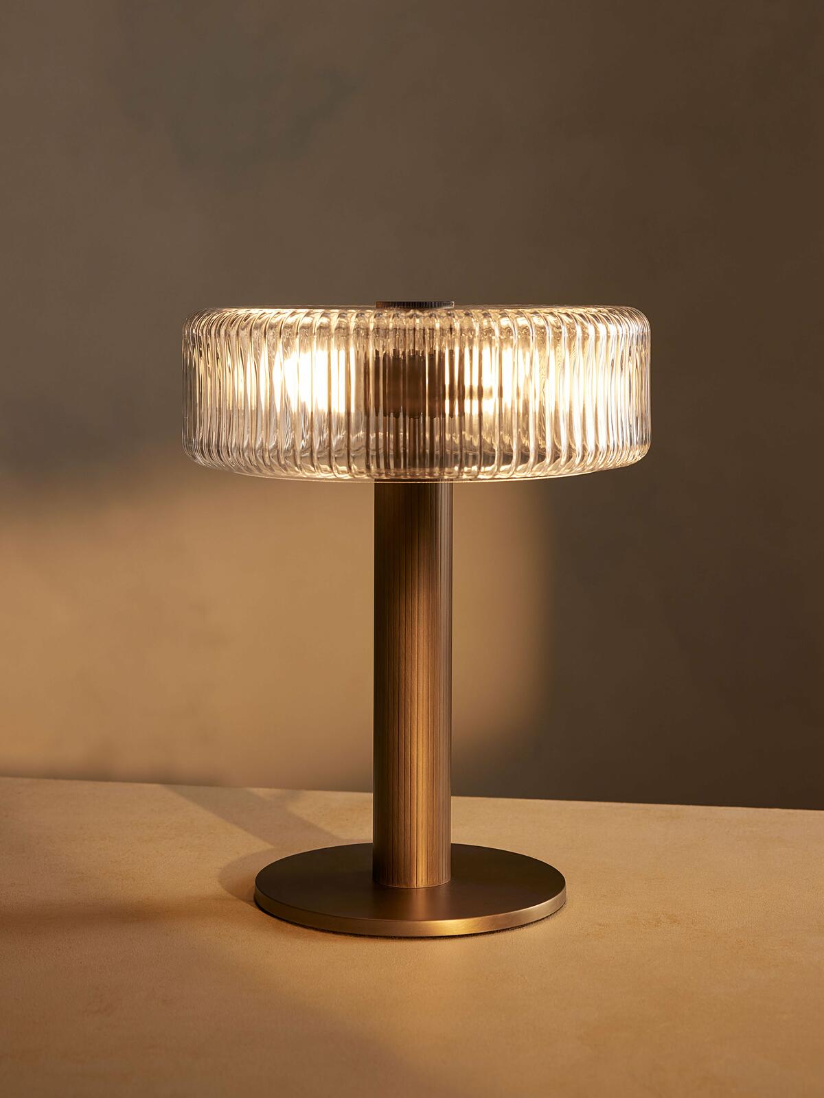 Influenced by the glamour of traditional American interiors, the Renato table lamp features a fluted column with an antique brass finish. The ribbed, faceted glass shade casts distinctive light patterns and shadows across the room. Look for similar styles in the North American Soho Houses, including Brooklyn’s DUMBO House.