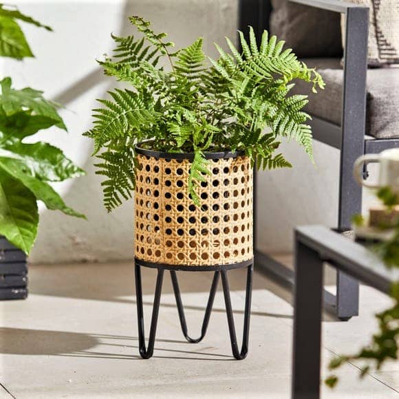 Featuring a rattan effect finish, our Sulu Small Rattan Effect Plant Pot Stand is a beautiful way to bring a contemporary yet classic look to any space. Handmade using iron, the plant pot stand is durable and strong for outdoor use. The plant pot stand comes fully assembled and fitted with a drainage hole.