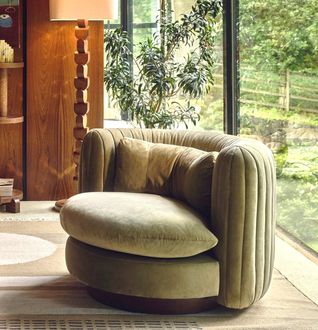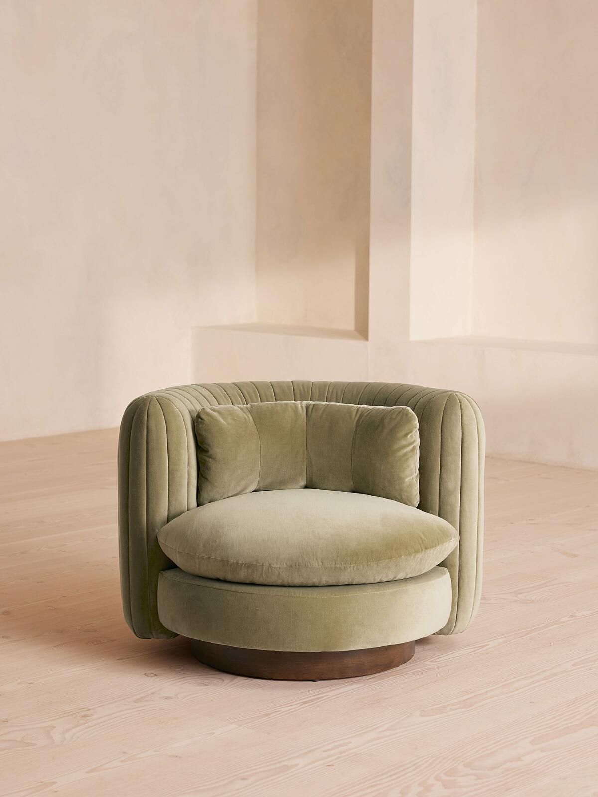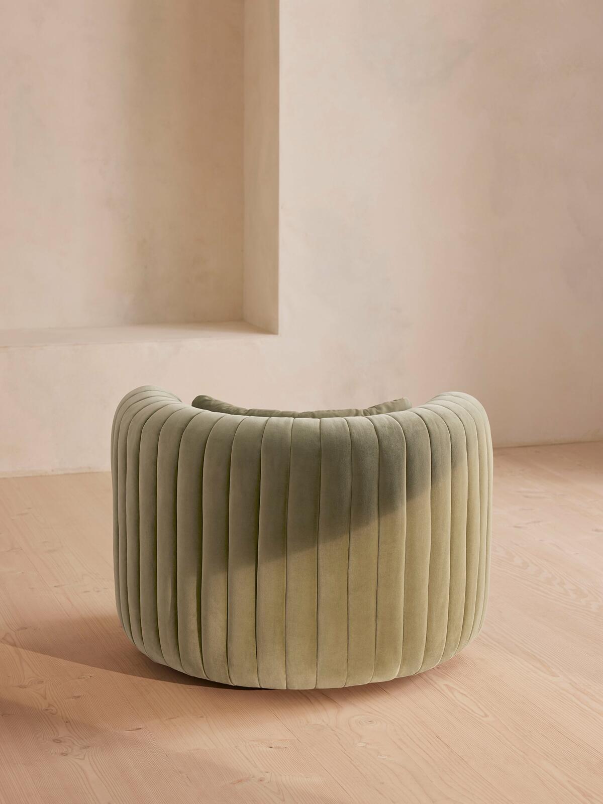 An extension of the Vivienne range, this swivel armchair takes its inspiration from the 1960s-style interiors of White City House. Upholstered in cotton velvet with pleated stitch detailing for an added tactile element, its curved shape is created with cosy, conversational moments in mind.